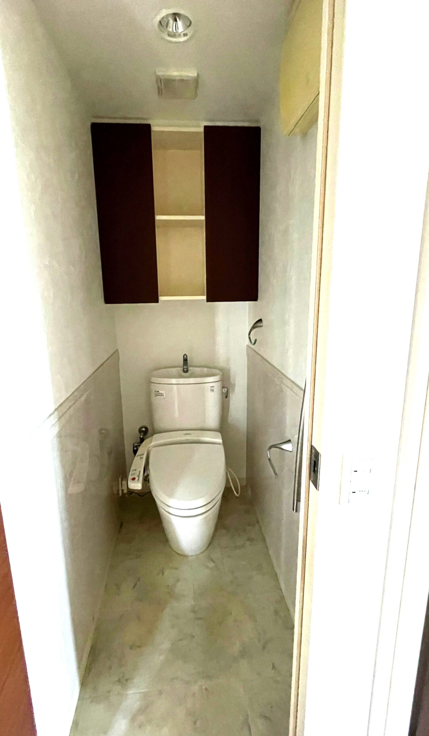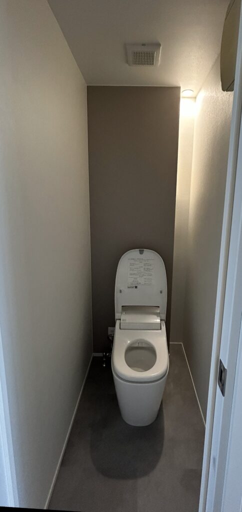 今回のトイレ全面改修では、便器背面に造作壁を設け、その壁裏に収納スペースを確保しました。限られた空間を有効活用しながら、すっきりとした印象を演出しています。さらに、造作壁の横へダウンライトを移設することで、壁面から漏れる柔らかな光が空間全体を包み込み、落ち着いた雰囲気を一層引き立てています。機能性とデザイン性を兼ね備えた、快適で心地よいトイレ空間へと生まれ変わりました。