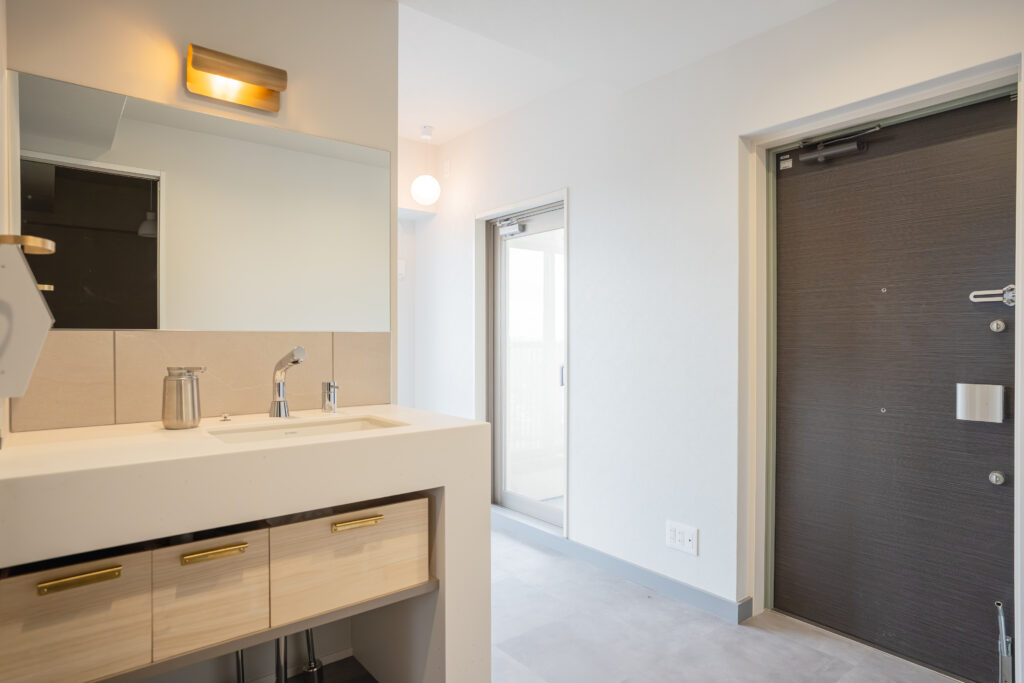 シンプルな空間の中でも印象に残る洗面スペースになりました。