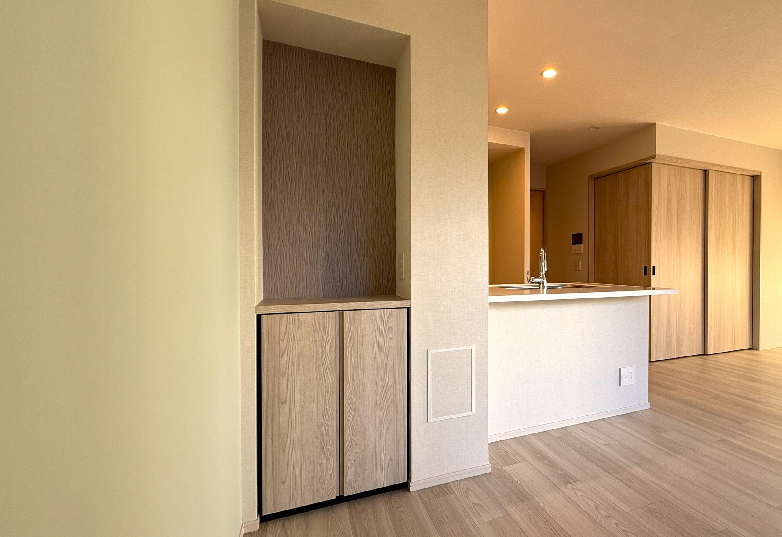 ニッチカウンタ―背面のアクセントクロスは、家具の色調と繋がったイメージに仕上て一体感をもたせています。
