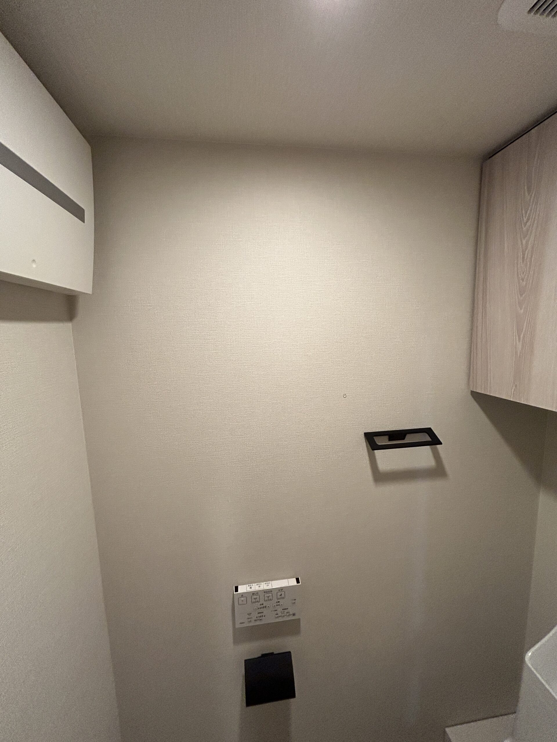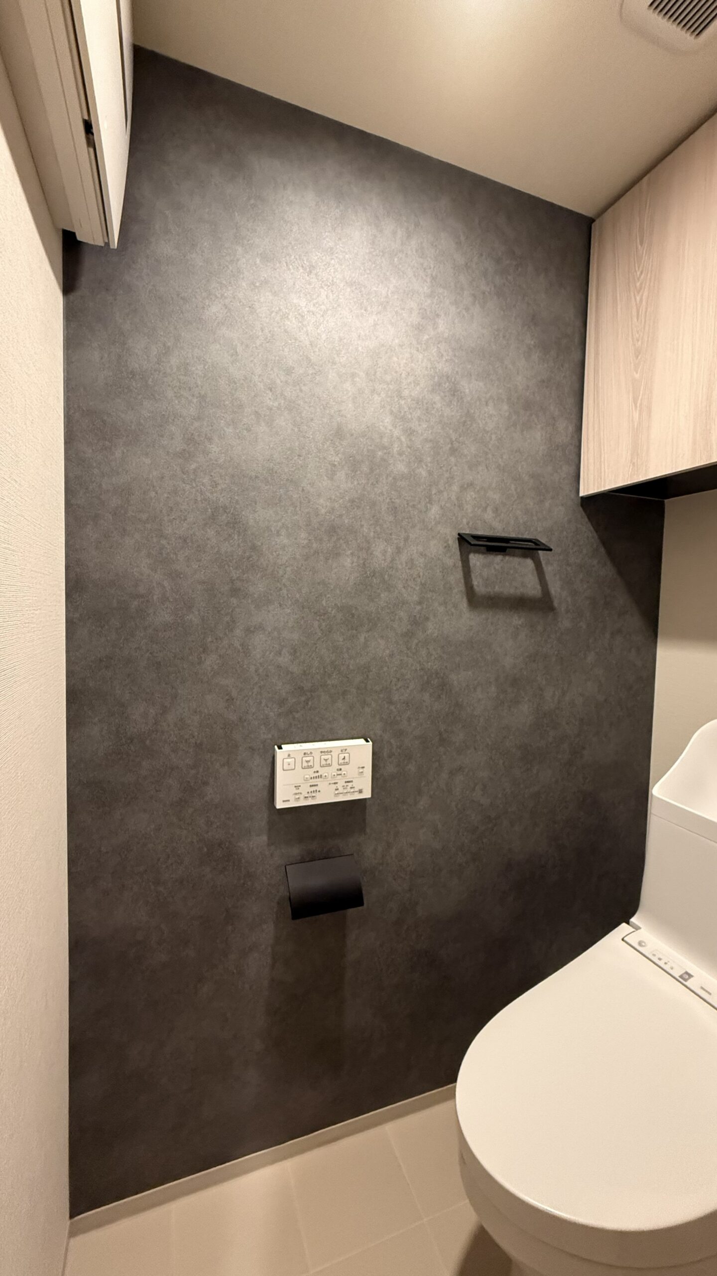 重厚感のあるアクセントクロスを取り入れ、トイレ空間をワンランク上の印象に仕上げました。
